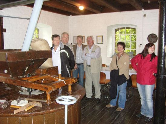 Aufgrund des schlechten Wetters hatte man die geplante Tour durch Holsterhausen und Deuten hin zur Mühle, nur mit PKW, aber nicht mit dem Fahrrad durchführen können und dennoch hatten die Teilnehmer viel Freude an der Führung durch die Mühle. Diese wurde durch Johannes Böing, einst selbst Müller dort, durchgeführt.