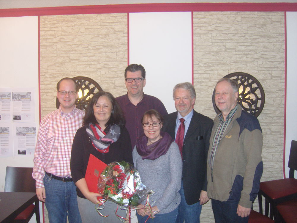 Auf dem Bild v.l.n.r.: Ortsvereinsvorsitzender Julian H. Fragemann,  Jubilarin Tanja Wiegand, Stadtverbandsvorsitzender Michael Baune, Ratsfrau Petra Somberg-Romanski, Fraktionsvorsitzender Friedhelm Fragemann und Kassierer Günter Pelloth.